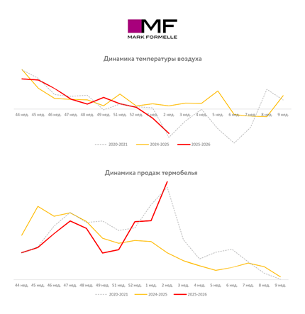 В топе оказались женские леггинсы и мужские кальсоны, выяснили в Mark Formelle на основе аналитики продаж. Так, только с 5 по 11 января 2026 года продажи термобелья Mark Formelle выросли в 3,6 раза в сравнении с аналогичным периодом прошлого года. Такой же пиковый спрос наблюдался около 5 лет назад при схожей погоде.